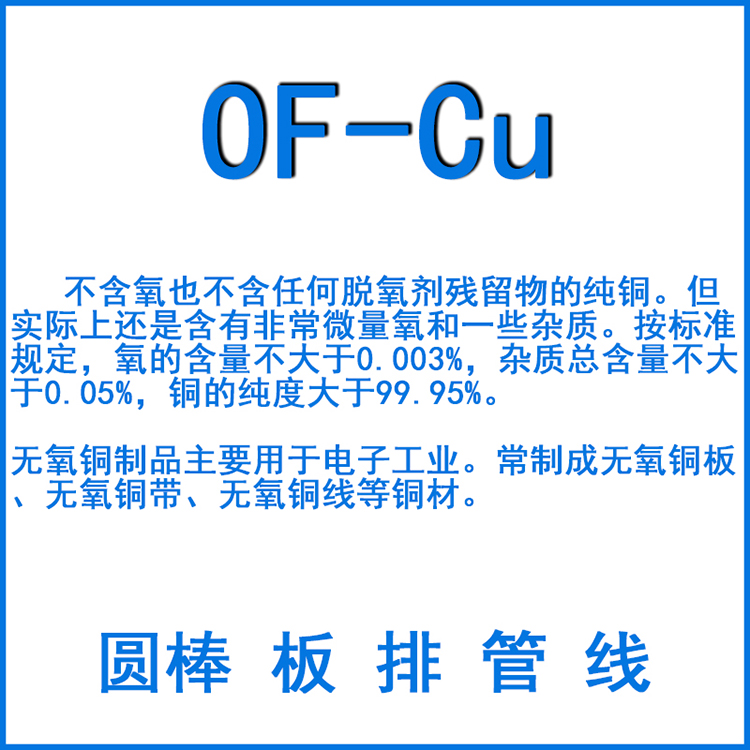 0F-CU無氧銅是不含氧也不含任何脫氧劑殘留物的純銅。但實(shí)際上還是含有非常微量氧和一些雜質(zhì)。按標(biāo)準(zhǔn)規(guī)定,氧的含量不大于0.003%,雜質(zhì)總含量不大于0.05%,銅的純度大于99.95%。根據(jù)含氧量和雜質(zhì)含量,無氧銅又分為一號(hào)和二號(hào)無氧銅。一號(hào)無氧銅純度達(dá)到99.97%,氧含量不大于0.003%,雜質(zhì)總含量不大于0.03%;二號(hào)無氧銅純度達(dá)到99.95%,氧含量不大于0.003%,雜質(zhì)總含量不大于0.05%。