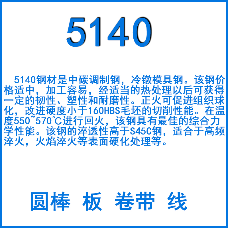 5140鋼材是中碳調(diào)制鋼,冷鐓模具鋼。該鋼價格適中,加工容易,經(jīng)適當(dāng)?shù)臒崽幚硪院罂色@得一定的韌性、塑性和耐磨性。正火可促進組織球化,改進硬度小于160HBS毛坯的切削性能。在溫度550~570℃進行回火,該鋼具有最佳的綜合力學(xué)性能。該鋼的淬透性高于S45C鋼,適合于高頻淬火,火焰淬火等表面硬化處理等。